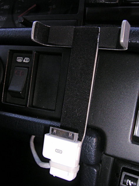 Der Halter ist fertig! Jetzt folgt die Installation im Auto. Eine geeignete Fläche am Armaturenbrett sollte eine gute Erreichbarkeit für die Bedienung und gute Ablesbarkeit des Displays erlauben. Also relativ weit oben. In einem Swedish Brick, also einem Volvo 700er bietet sich zum Beispiel der Platz auf den Fotos an. Andererseits ist es vielleicht einen gute Idee, wenn der iPod auch von der Beifahrerseite gut zu bedienen ist.