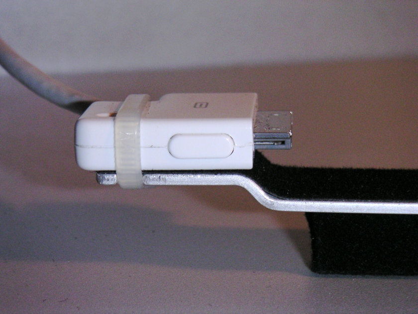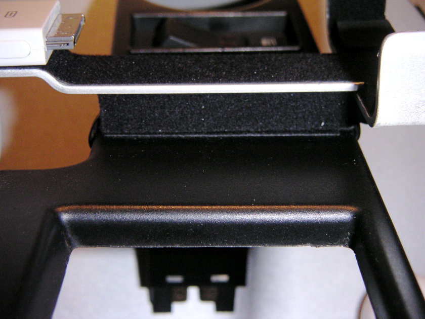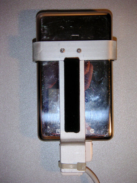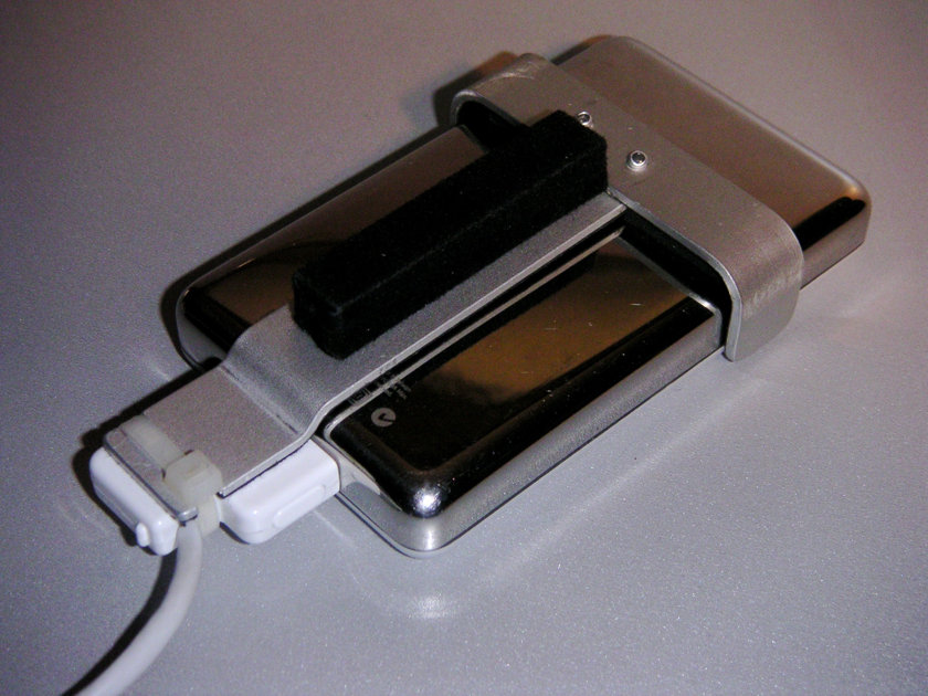 Die durch die kreuzförmige Verbindung entstandene Höhendifferenz der Seitenwangen zur Rückseite des iPod habe ich durch entsprechend dicke Moosgummistreifen ausgeglichen, damit das iPod auch keine Drehbewegung um den Rücken (und damit um den Connector) machen kann.