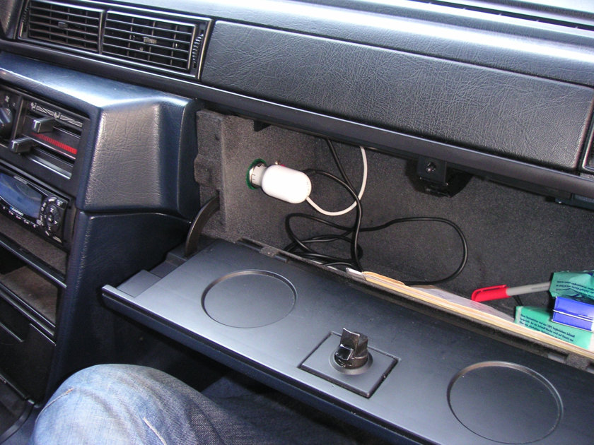 Nachdem die Bilder oben einen Überblick über den fertigen Halter in Aktion geben, hier noch ein kleiner Blick in das Handschuhfach. Dort habe ich eine weitere Borspannungssteckdose im Zigarettenanzüngerformat untergebracht, die den Belkin-Stecker aufnimmt. In erster Linie wollte ich dadurch häßlichen Kabelsalat im Innenraum vermeiden. Schließlich muß von dem Belkin-Stecker noch das Audio-Kabel zum Radio bzw. zur Anlage geführt werden. Bei der jetzigen Lösung sieht man kein störendes Kabel im Innenraum. Das kann auch nützlich sein, um Langfingern keinen zu deutlichen Hinweis auf versteckte Gerätschaften zu geben.