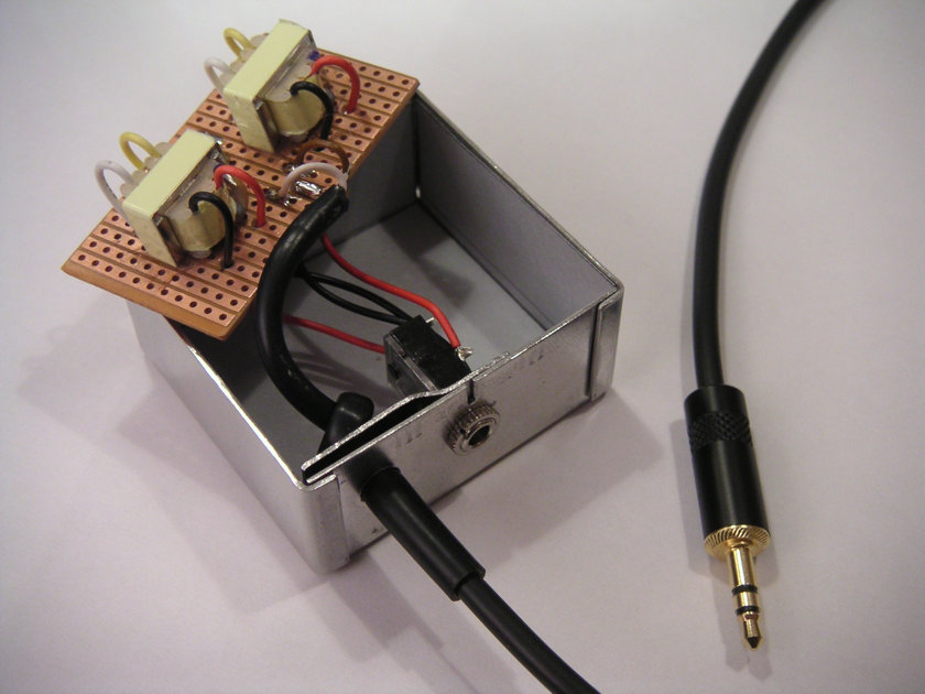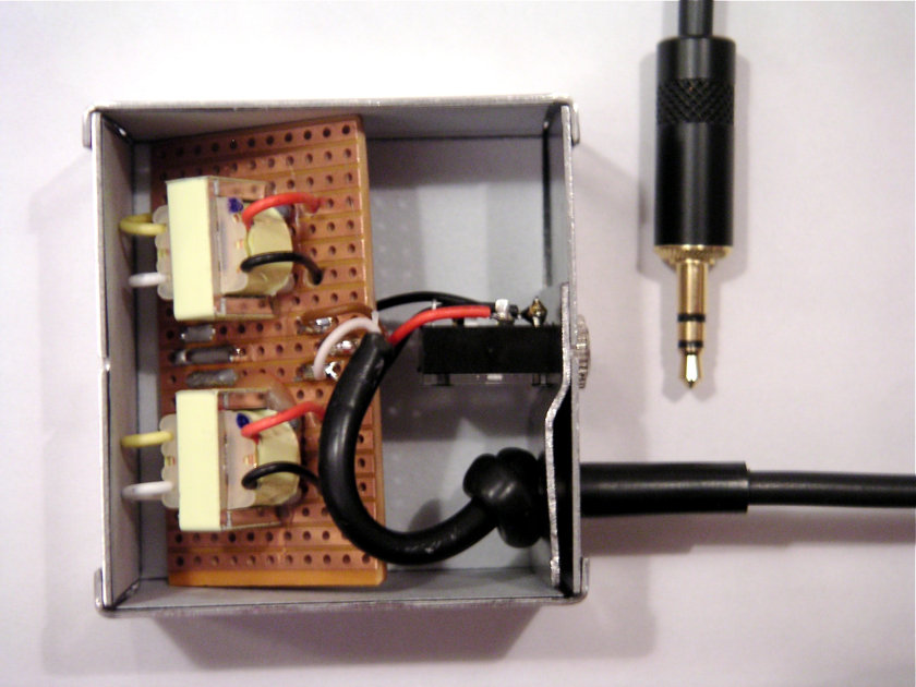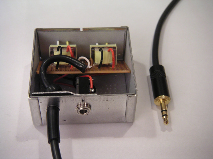 Theoretisch ist diese Lösung perfekt, da eine galvanische Trennung der Signalleitung die Störgeräusche sicher eliminiert. Ich hatte aber zunächst solch ein fertig vergossenes Teil von Conrad-Elektronik besorgt. Die Störgeräusche waren zwar tatsächlich verschwunden, doch der Frequenzgang und der Frequenzverlauf waren derartig inakzeptabel, daß ich das Gerät sofort zurückgebracht habe.