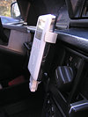 Für meine Lösung habe ich an den Rücken des Halters noch ein Stück Vierkantrohr 10 x 10 x 1 mm angenietet. Durch das Rohr habe ich vertikal einen dicken schwarzen Kabelbinder geführt, den ich auch um das darunterliegende Kunstoffstück des Armaturenbrettes geführt habe. Diese Lösung hat den Vorteil, daß keine Bohrungen o.Ä. an Innenraumteilen vorgenommen werden müssen.