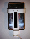 Wichtig ist, daß man für dieses Teil sehr genau Maß nimmt, schließlich soll das iPod ja später spannungsfrei im Halter sitzen. Am einfachsten geht das, wenn man das iPod mit eingestecktem Dock-Connector und dem Display nach oben auf eine gerade Fläche legt und den entstehenden Spalt zwischen Dock-Connector und Fläche mißt. Achtung: Der Stecker sitzt nicht parallel zur Oberfläche des iPod. Das muß beim biegen des Z-förmigen Rückens unbedingt beachtet werden! Wie gesagt - beim Biegen unbedingt oft "anprobieren".
